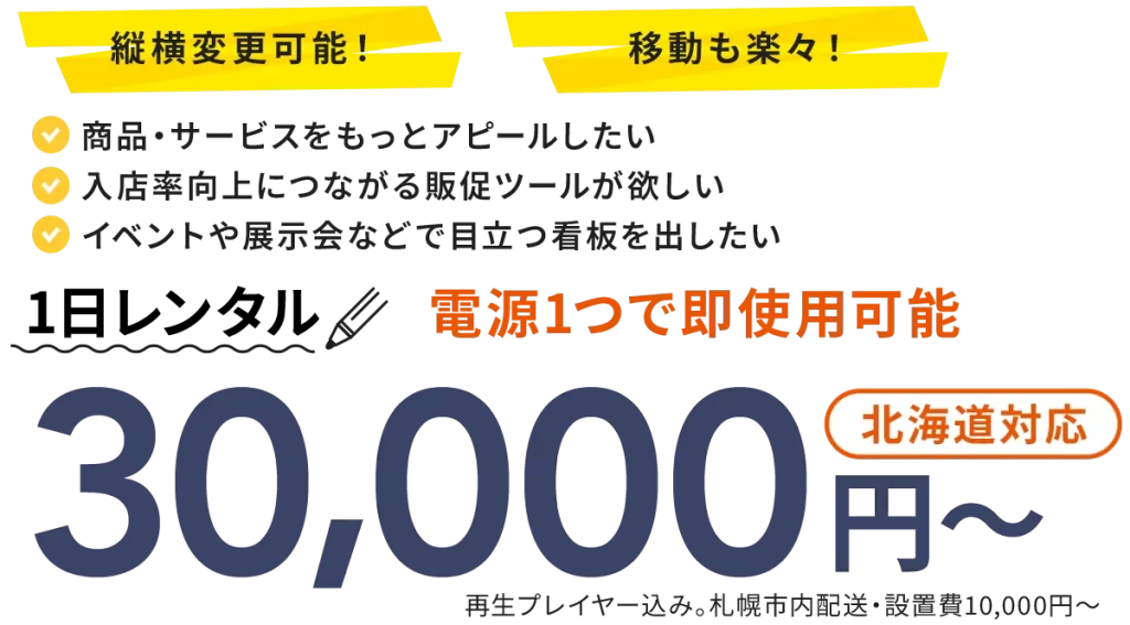 お客様のニーズに合わせた柔軟な料金プランをご用意しました。すべて税抜価格です。再生プレイヤー込み。札幌市内配送・設置費10,000円〜